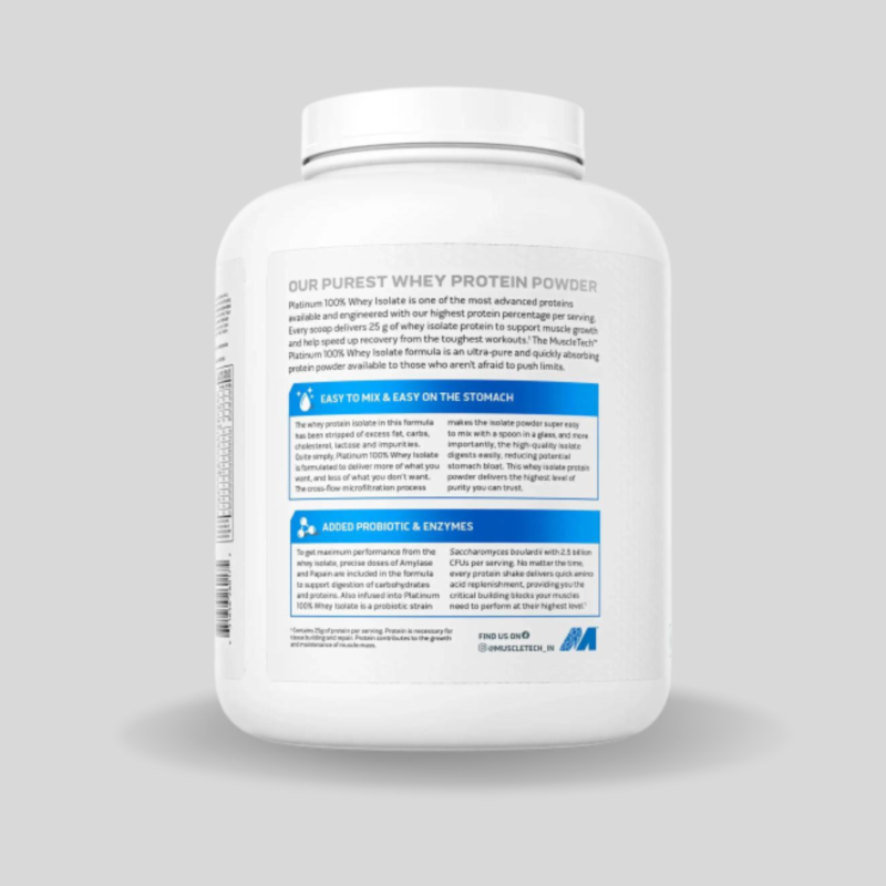 MuscleTech Platinum 100% Whey Isolate is a whey protein supplement designed to provide fastacting protein to support lean muscle growth and performance. This formula is made from a combination of fastacting, ultrafiltered whey protein isolate and hydrolyzed whey peptides for an easily digestible and quickly absorbed form of protein. It’s free of lactose, fat, trans-fat, cholesterol, sugar, and carbohydrates, and provides 18g of protein per 19g serving. It also contains 5.8g of naturally-occurring BCAAs to help support recovery from exercise. This whey protein isolate is designed to digest quickly, providing an ideal choice for taking before and after exercise and any time throughout the day when you need a protein boost. Every serving offers a massive 27.6g of essential and branched-chain amino acids (EAAs and BCAAs) that can help maximize muscle building and recovery. For added convenience, MuscleTech developed MicroPure, a state-of-the-art whey protein concentration method that filters out impurities for superior protein potency.