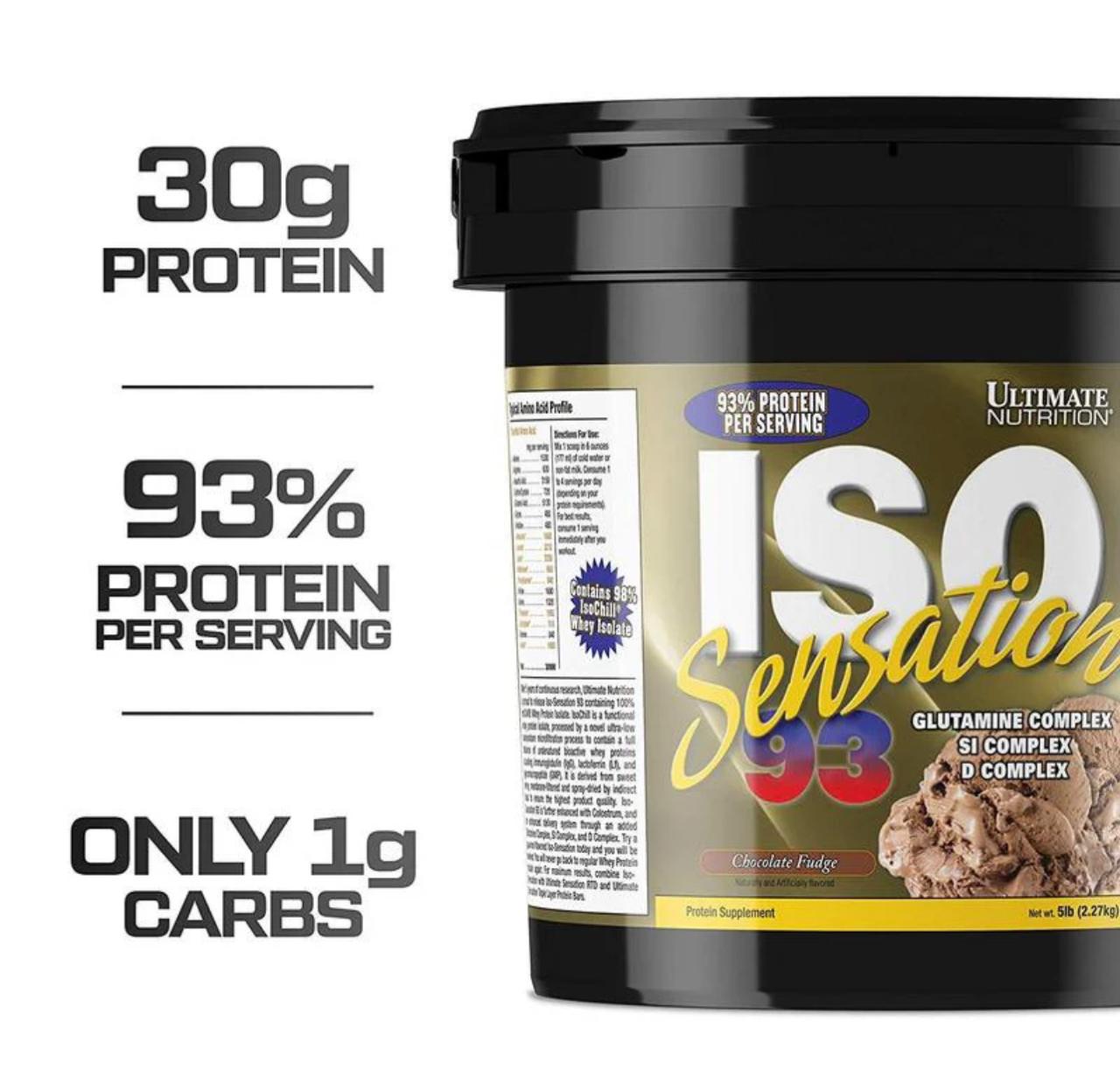 - Ultimate Nutrition ISO Sensation 5 lb Chocolate Fudge assists in the prevention of breakdown of your muscles